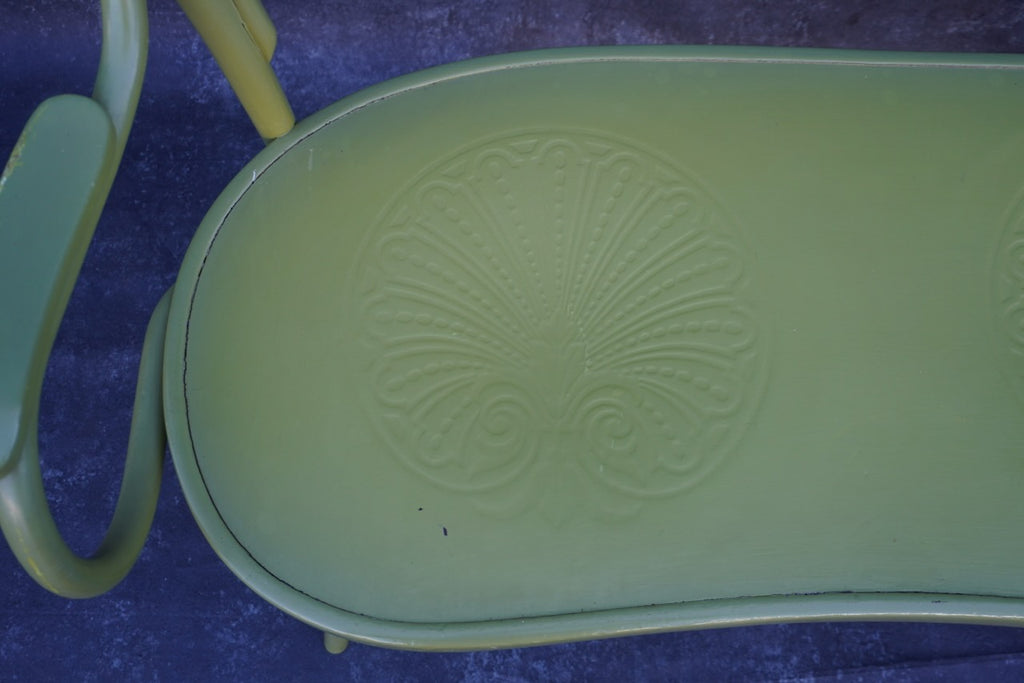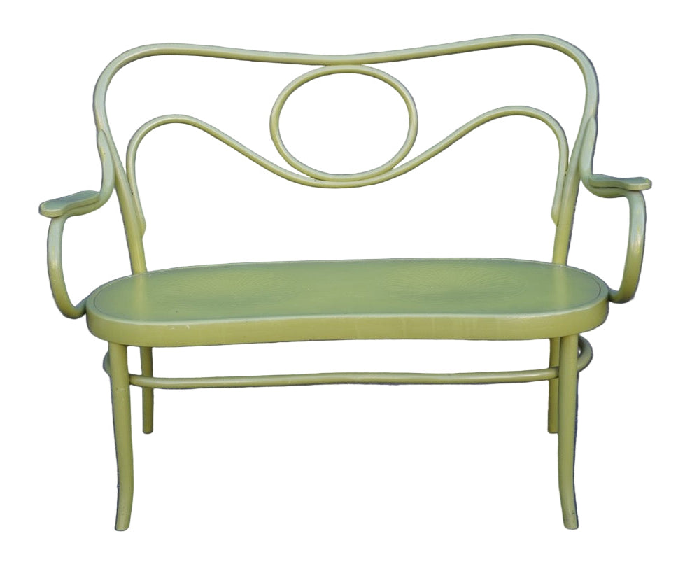 This 1904 Thonet bench has been thoughtfully refurbished with a bold pop-art touch. Professionally restored and painted in a striking bright lime green, it transforms a classic design into a contemporary statement piece. Thonet, celebrated for pioneering bentwood furniture in the 19th and early 20th centuries, produced pieces known for their elegant curves, durability, and timeless appeal. This bench embodies that heritage while presenting a truly unique artistic twist—you will not find another Thonet piece quite like it.