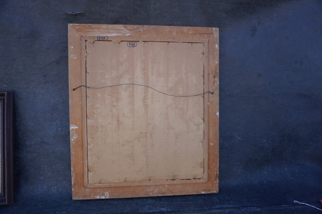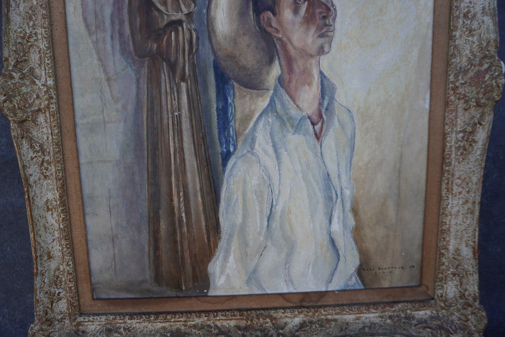 Shattuck’s palette of warm earth tones, muted blues, and soft neutrals enhances the quiet, introspective mood of the work. The brushwork is precise yet painterly, particularly in the handling of the clothing and the textured stone background. Housed in an ornate, distressed antique frame that complements the painting’s tonal harmony and historical ambiance. A compelling and atmospheric example of Shattuck’s mid-century output.