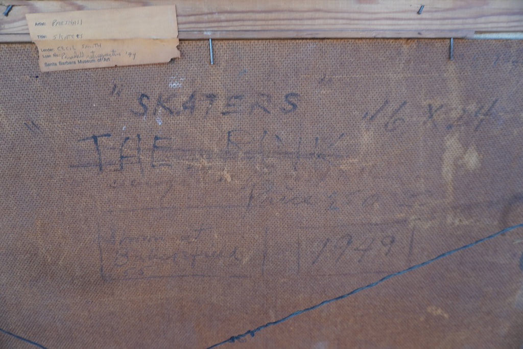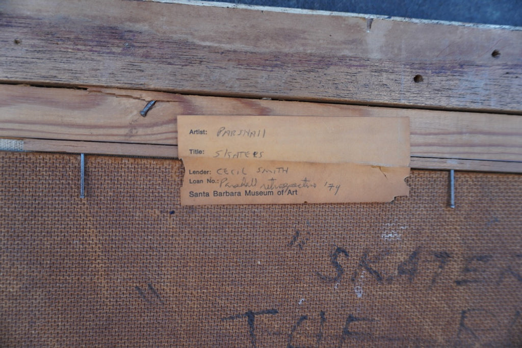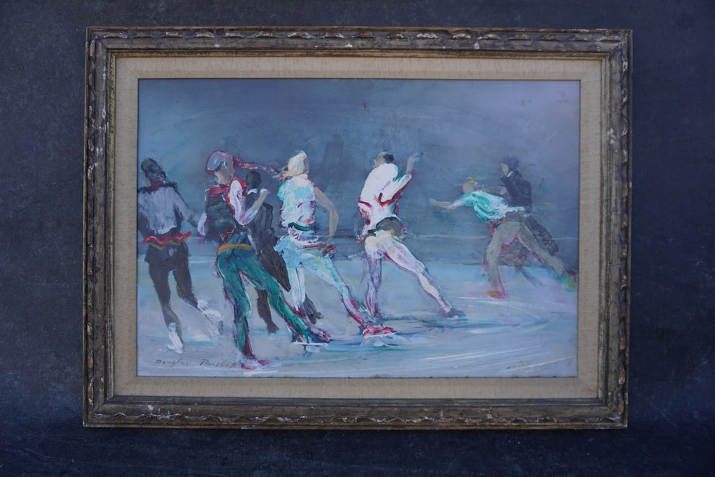 Energetic mid-century painting by Douglas Parsnall, depicting a group of skaters in motion across an icy surface. Executed with loose, expressive brushwork, the figures are captured mid-stride, emphasizing movement, rhythm, and spontaneity. Parsnall’s cool blue-gray ground contrasts with flashes of red, green, and white, giving the composition both depth and vitality.
