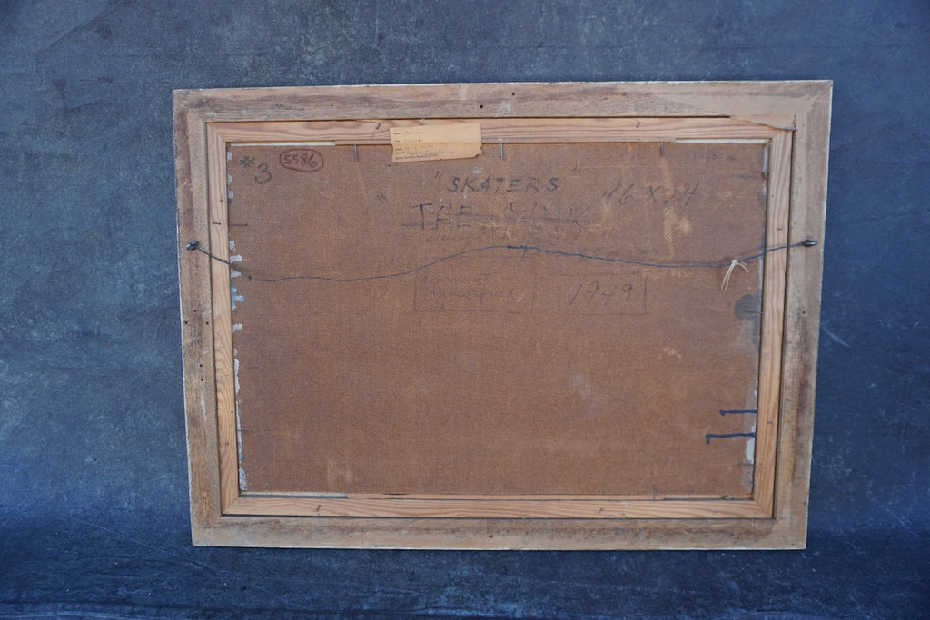 The painterly handling and abbreviated forms reflect the postwar modern sensibility of the late 1940s, where atmosphere and motion take precedence over strict detail. Housed in a period frame with linen liner and age-appropriate wear, this work is a lively and evocative example of mid-century figurative painting.