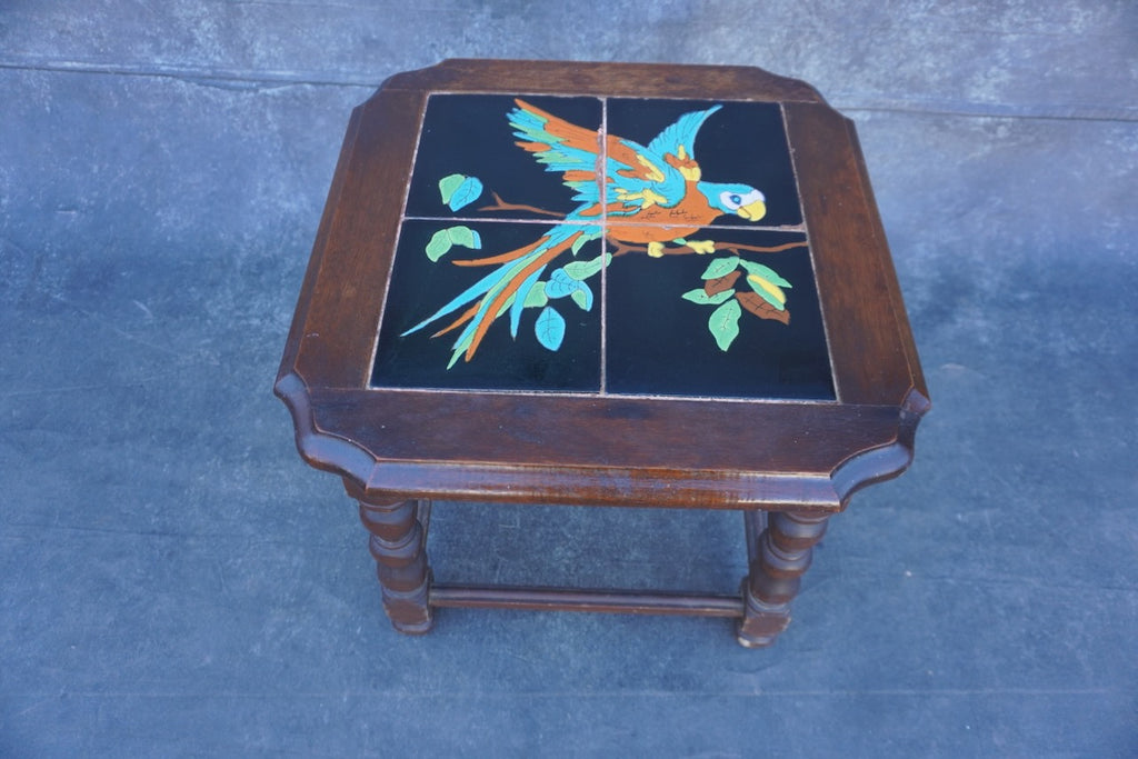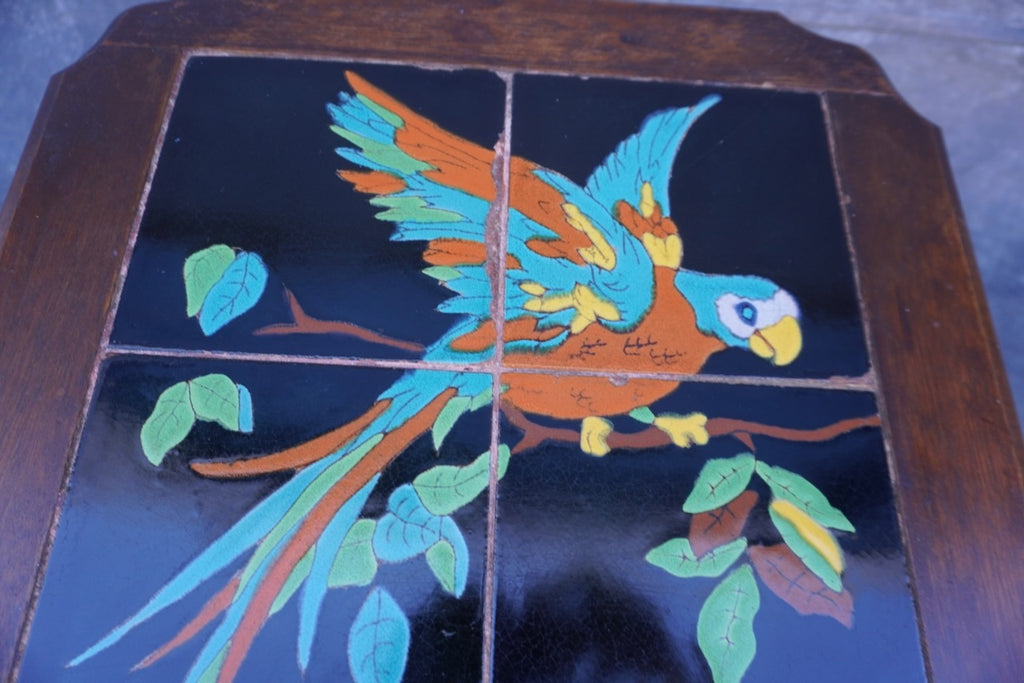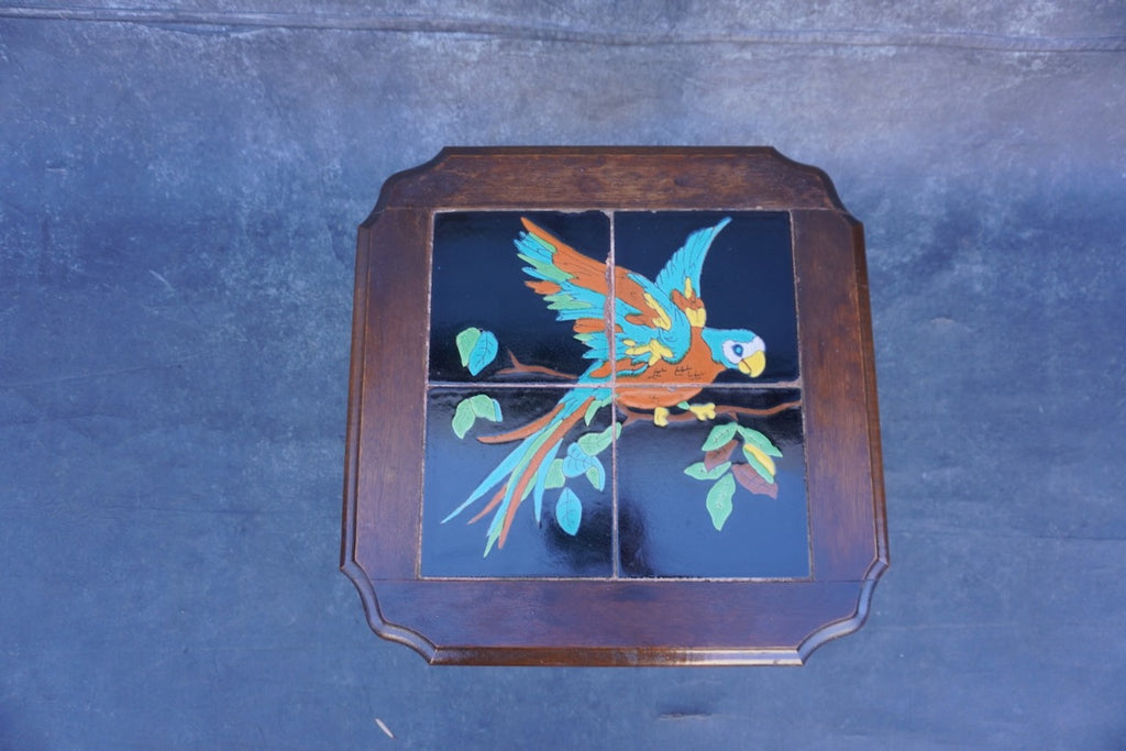 A striking classic Taylor tile table featuring a vibrant parrot scene across its surface. The parrot’s brilliant colors truly stand out against the deep black backdrop, creating a bold and elegant composition. The table is sturdy and in excellent condition, showing only very minor wear on the wooden base, consistent with age and gentle use.