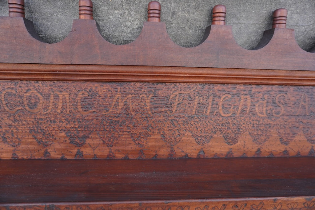 The upper panel features the welcoming inscription, “Welcome My Friends All,” adding charm and character that reflects the hospitality and craftsmanship of the early 20th century. Its scalloped crest rail, turned side supports, and long display shelves provide both decorative appeal and practical storage for plates or treasured collectibles.