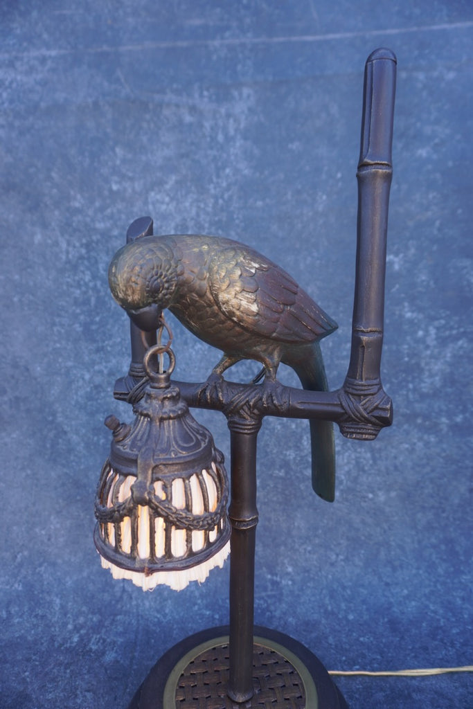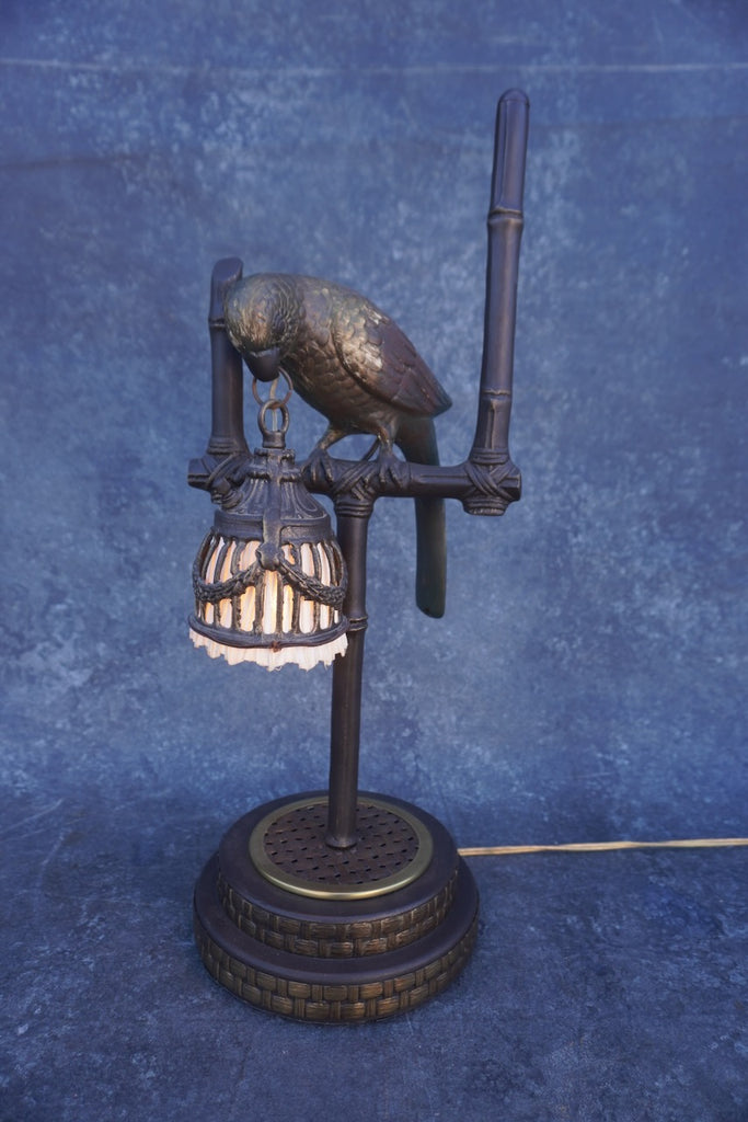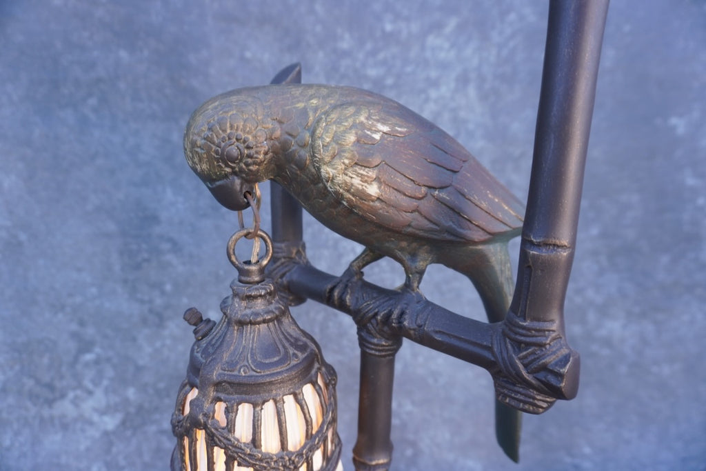 This high-quality brass parrot lamp is full of character and charm. Perched on a bamboo stand and gently grasping a hanging lantern, the parrot brings a whimsical yet elegant touch to any space.