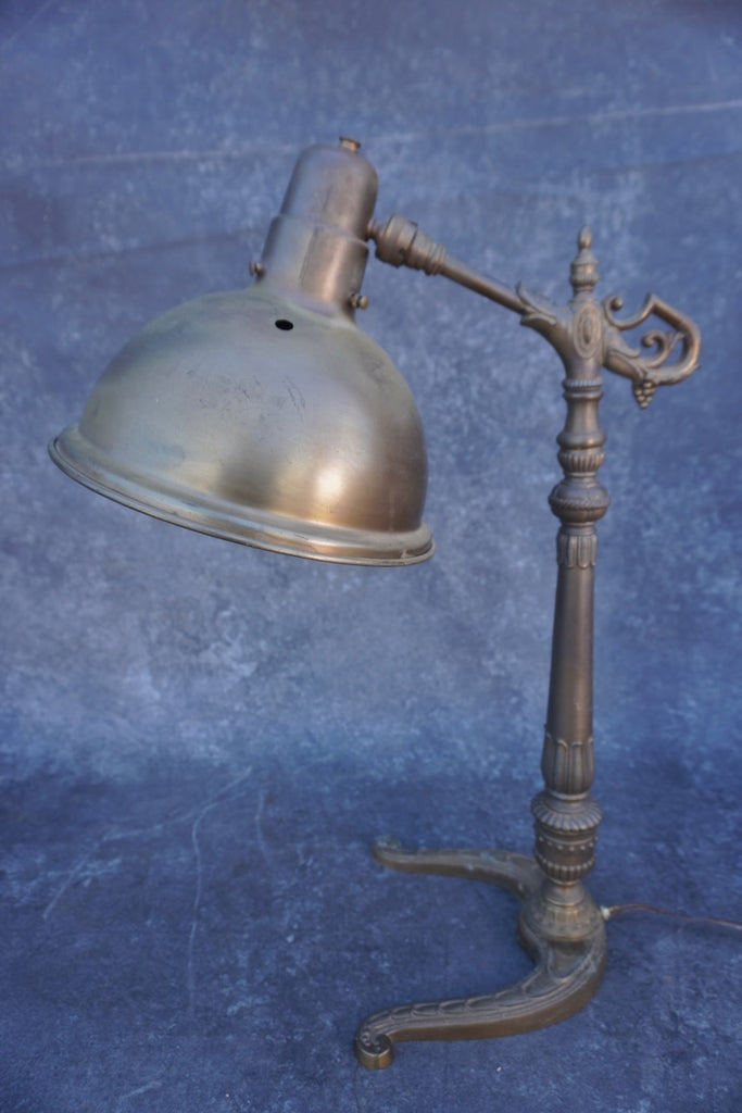 This striking jeweler’s lamp features a distinctive blend of industrial and Art Nouveau design elements. The sculptural metal base showcases elegant lines and craftsmanship typical of the early 20th century, while the interior is lined with blue reflective glass, creating a unique glow when illuminated.