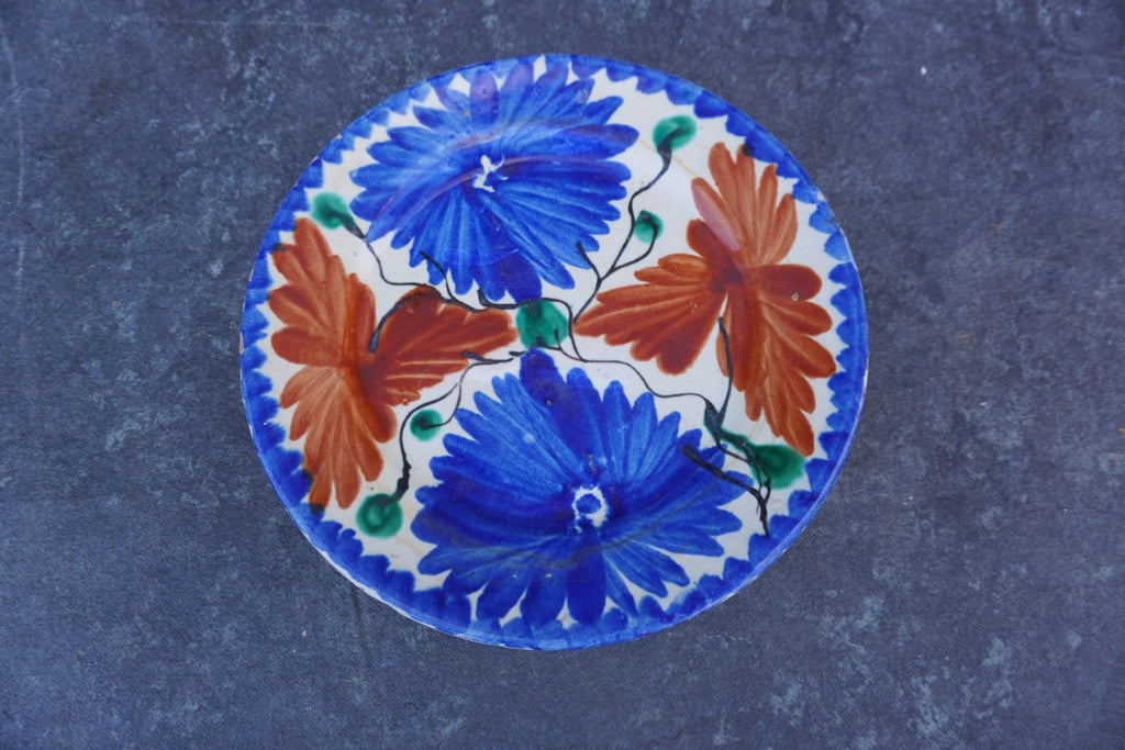 This charming hand-painted salad plate (size larger than similar listing of 6-set) was crafted in Oaxaca, Mexico between the 1940s and 1950s. Slightly irregular in shape and size, reflecting the artisanal nature of their production. Featuring a vibrant blue and orange floral motif, the design captures the bold, folkloric aesthetic characteristic of traditional Oaxacan pottery. A wonderful addition to any vintage ceramics collection or a colorful accent for everyday dining.