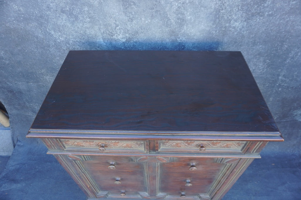 This well-built, substantial dresser features a classic European design with foliage detailing on the top two drawers, adding a touch of charm. The piece is solid and heavy, a testament to its quality craftsmanship.