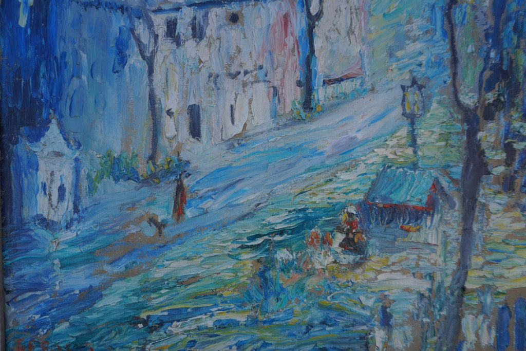 This original work, signed in the bottom left corner, showcases a masterful Impressionist technique. While the artist's signature is unfortunately illegible, the painting's quality speaks for itself. The vibrant blue color palette and expressive brushwork bring the composition to life. Presented in a modern silver wood frame that complements the artwork beautifully. Circa 1940s.