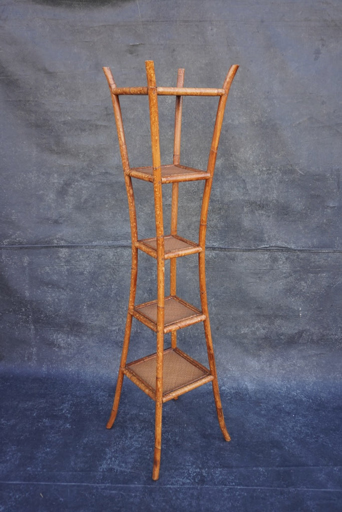 Beautiful antique bamboo and rattan 5-tier corner shelf, full of natural character and timeless charm. The bamboo displays a lovely speckled finish, creating subtle, organic patterns that resemble soft watermarks—an appealing detail that adds depth and visual texture to the piece.