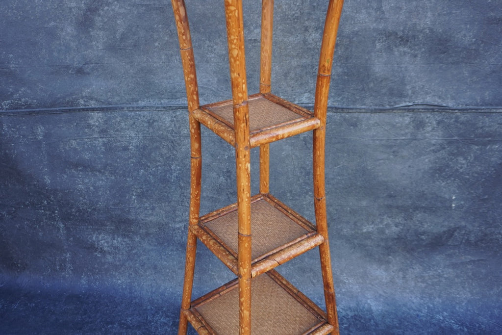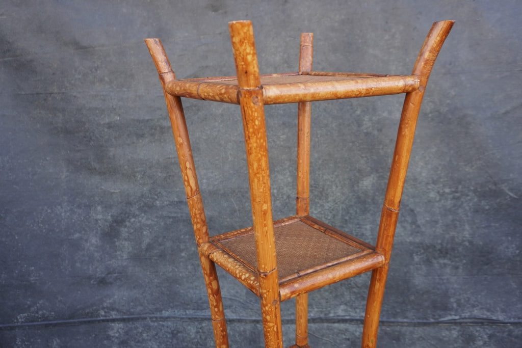 As with many antique bamboo pieces, there are minor condition imperfections consistent with age and use, all of which add to its authentic vintage presence. This shelf remains a striking example of early bamboo craftsmanship and a versatile decorative accent for a variety of interiors.