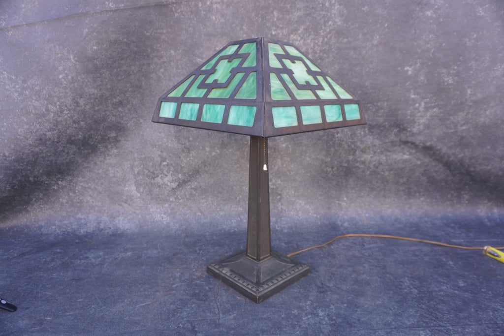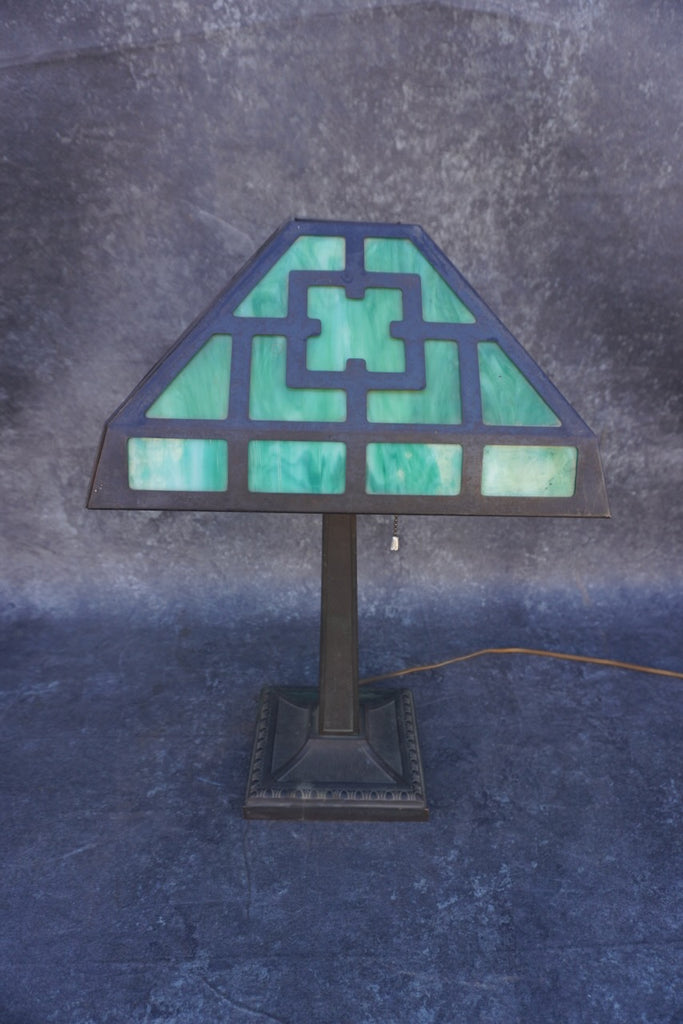 Circa 1930s, this exquisite lamp exemplifies the craftsmanship and design elegance of the Arts and Crafts movement. Featuring a finely cast bronze body and a vibrant turquoise green stained glass shade, it remains in excellent condition with only minimal signs of wear. Fully functional, the lamp emits a warm, ambient glow that would enhance any space.