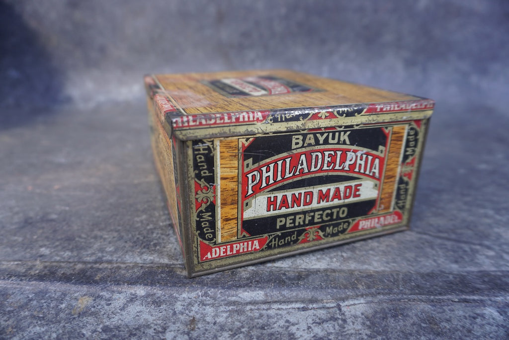 Authentic Vintage 1920's Bayuk Philadelphia Hand Made Perfecto Cigars Tin Box with a lithograph print. All original condition with some wear and scratches, which add to the charming patina.