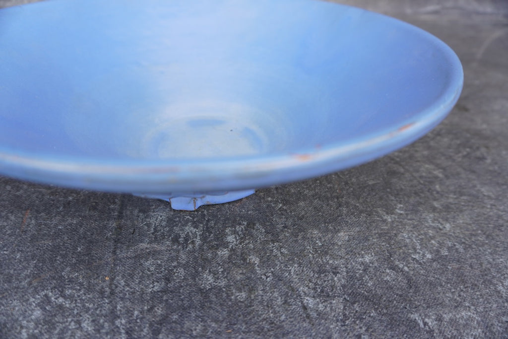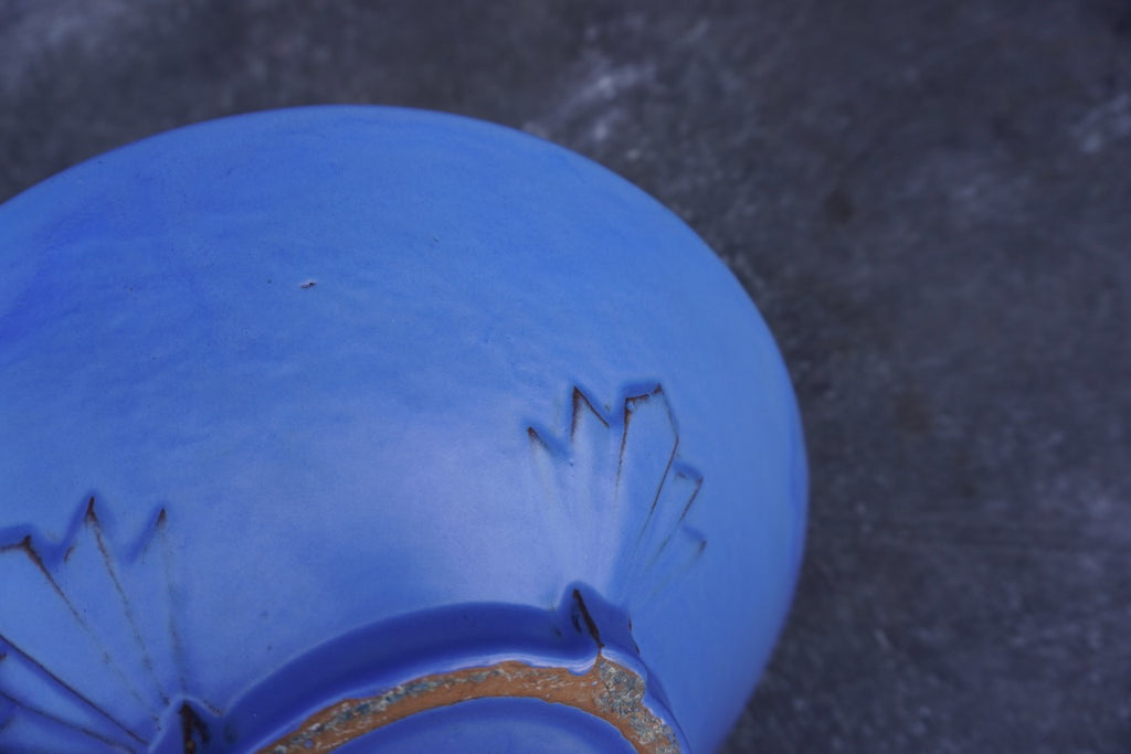 A Catalina Island red clay bowl finished in a matte blue glaze, featuring incised chevron detailing around the exterior. The low, wide form highlights the contrast between the soft matte surface and the warm red clay body beneath, characteristic of Catalina Island Pottery production.