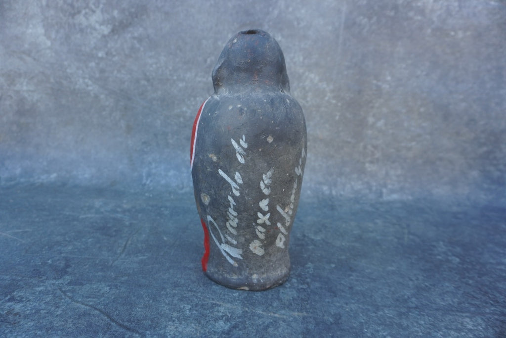 A charming hand-painted ceramic mezcal bottle in the form of a monkey, known as a Chango Mezcalero. Originating in Oaxaca between the 1930s and 1940s, these playful vessels were traditionally crafted to store and sell mezcal—the smoky agave spirit long beloved in Mexico.