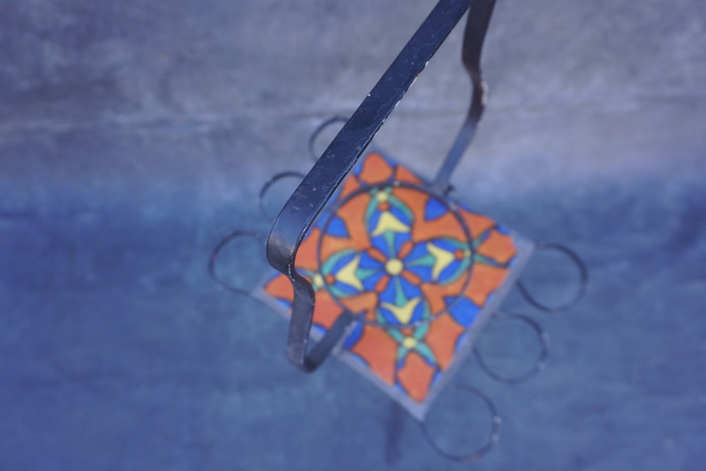 This exceptional Malibu tile drink table showcases both beauty and functionality. It features a sturdy wrought iron base with a decorative top handle and six integrated cup holders — three on each side — perfect for entertaining or display. The tabletop is adorned with vibrant orange and blue tile with a striking geometric floral design, a classic example of Malibu craftsmanship.