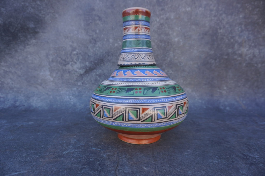 This striking traditional clay botellón (water jug) showcases a vibrant Aztec-inspired design, richly painted in bold, earthy colors. Both the jug and its matching cup feature intricate geometric patterns and symbolic motifs that celebrate Mexico’s ancient artistic heritage. The cup fits neatly over the top of the jug, serving as a lid and making it the perfect functional and decorative bedside carafe. A stunning example of Mexican folk artistry that blends cultural tradition with everyday utility.