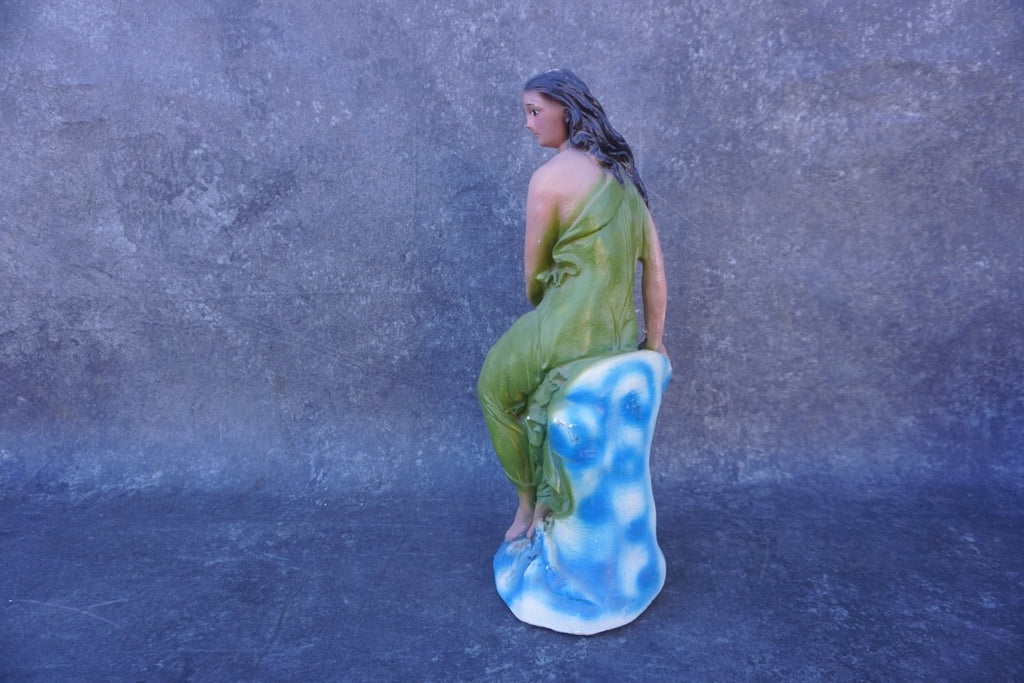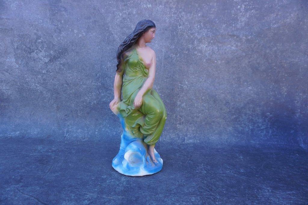 This elegant Mexican plaster figure from the 1940s depicts a lady seated gracefully on a pedestal, embodying the charm and artistry of mid-20th-century Mexican decorative sculpture. During this period, Mexico experienced a flourishing of popular and folk arts, influenced by both post-revolutionary nationalism and a growing appreciation for handcrafted decorative objects.
