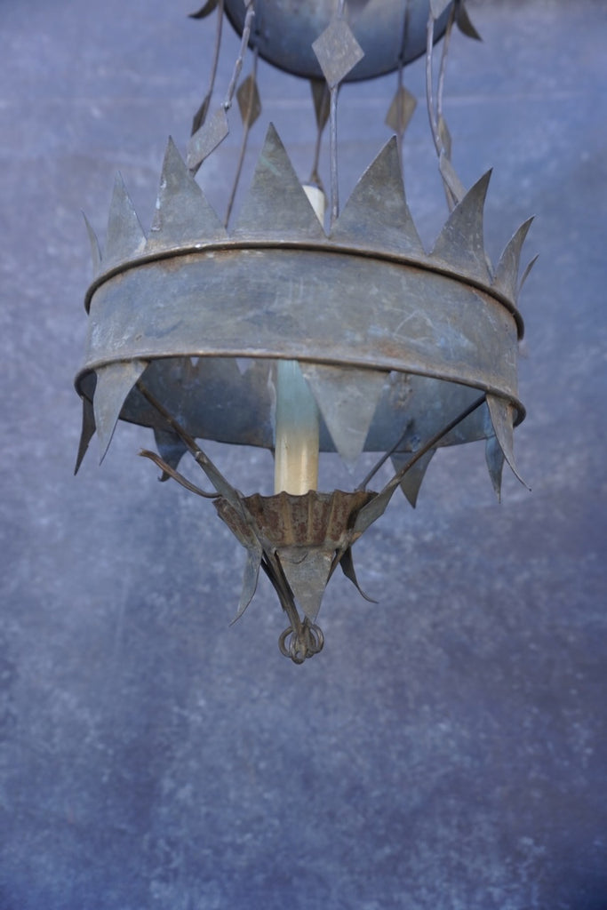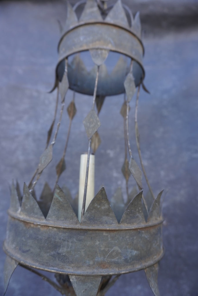 Mexican Tin Pendant Light circa 1930s to 1940s features a hand-formed metal frame with a crown-like design and delicate diamond-shaped accents. The sculptural, openwork structure gives it an airy elegance while the aged patina adds a timeworn charm.