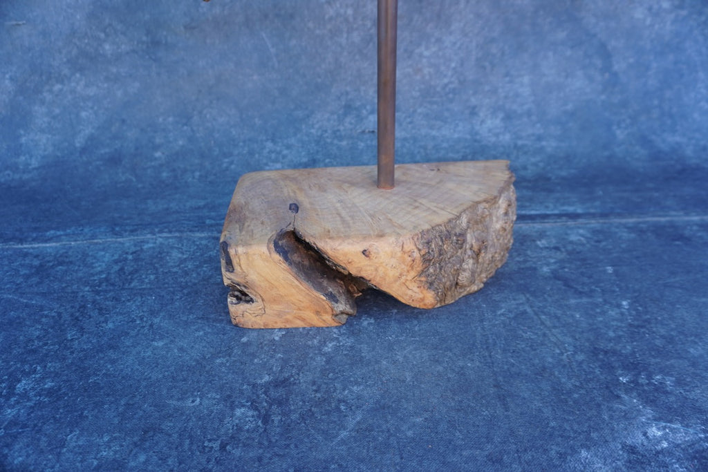 Hand-carved wooden profile of a Native American chief, featuring a detailed feathered headdress and strong, stylized facial features. Mounted on a metal rod with a natural burled wood base, giving it a rustic, sculptural display. Dating to the 1930s. Good antique condition with typical age-related wear, as shown in photos. A unique decorative piece with classic folk art appeal, perfect for display.