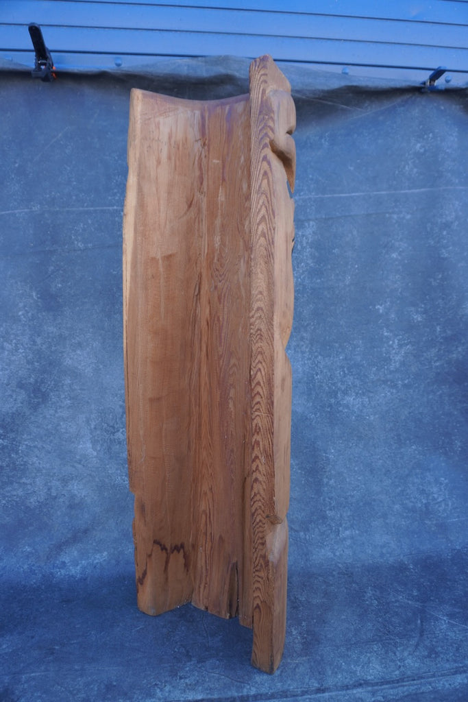 We are uncertain of the exact tribe it comes from, and out of respect, we do not wish to assume. Features light wood with defined wood grain. Faces are stacked, each with large eyes and red lips — the red lips and exaggerated grin could indicate a Haida or Tsimshian tribes.