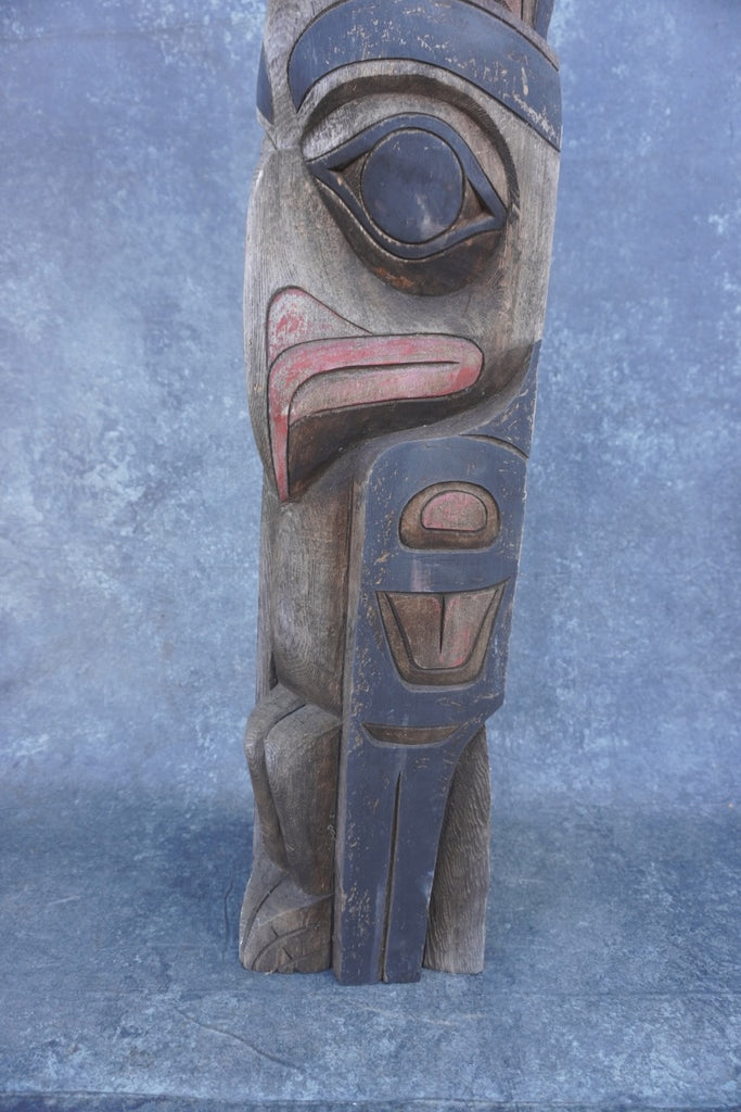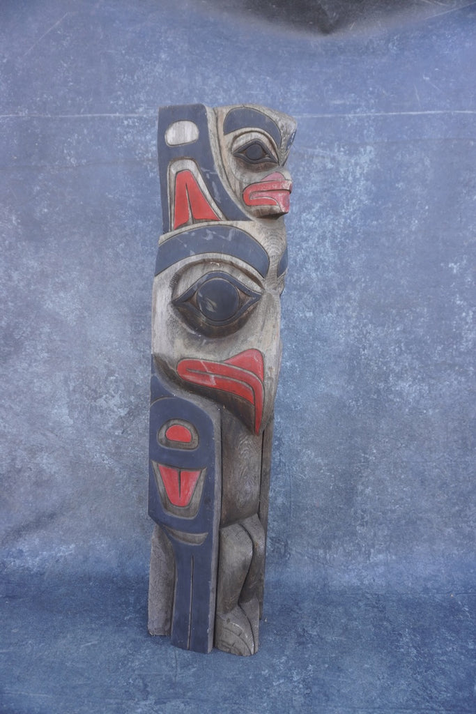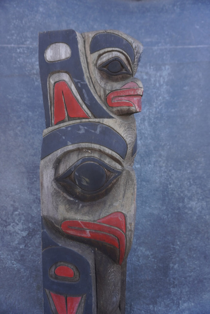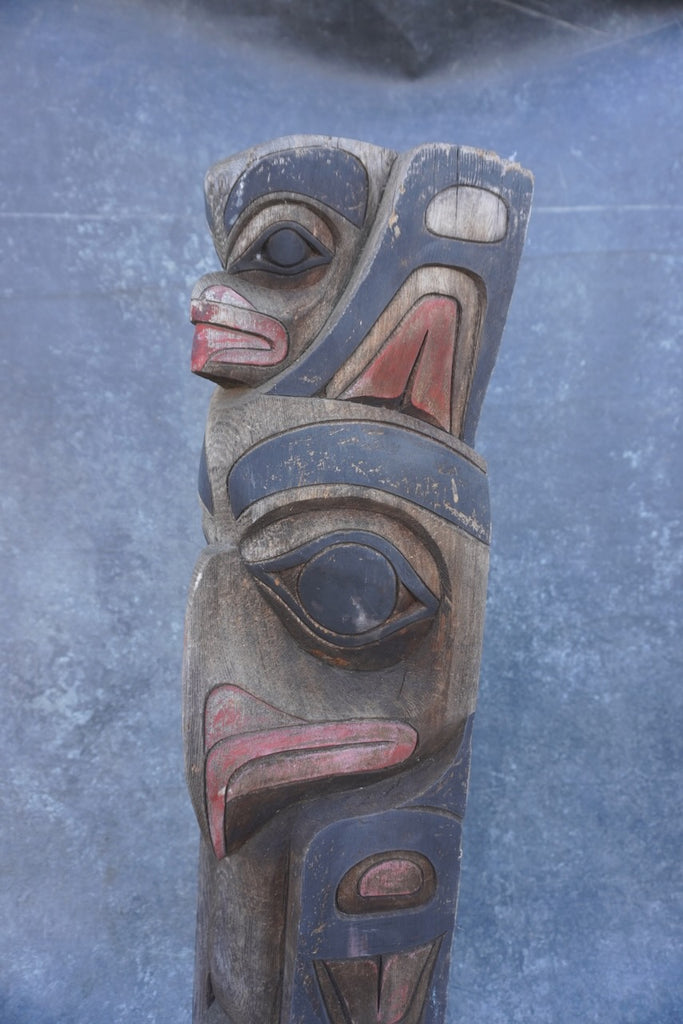 This totem pole is traditional art of the Indigenous peoples from the Northwest Coast of North America, particularly those from British Columbia, Canada, and parts of southeast Alaska.