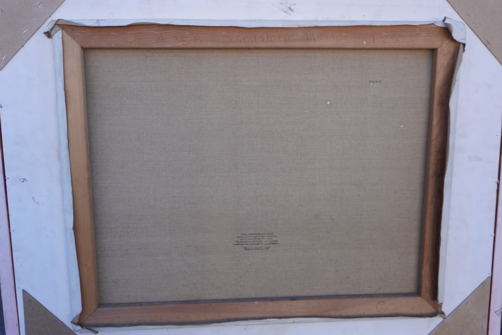 An incredible desertscape by celebrated California painter Sam Hyde Harris, renowned for his luminous depictions of the American West. This composition captures the vast serenity of the desert through rich, layered colors and masterful brushwork that draw the viewer into the scene. The artwork is beautifully presented in a bold, gilded frame that enhances its warmth and depth.