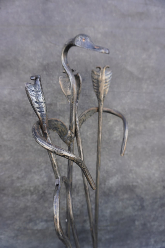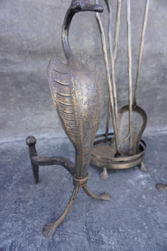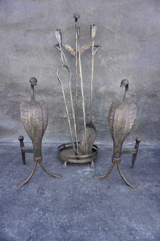 This original Cahill Iron Works Waterfowl Fireplace Tool Set is a rare and highly collectible example of American Arts & Crafts–era ironwork, celebrated for its distinctive sculptural form and handcrafted character.