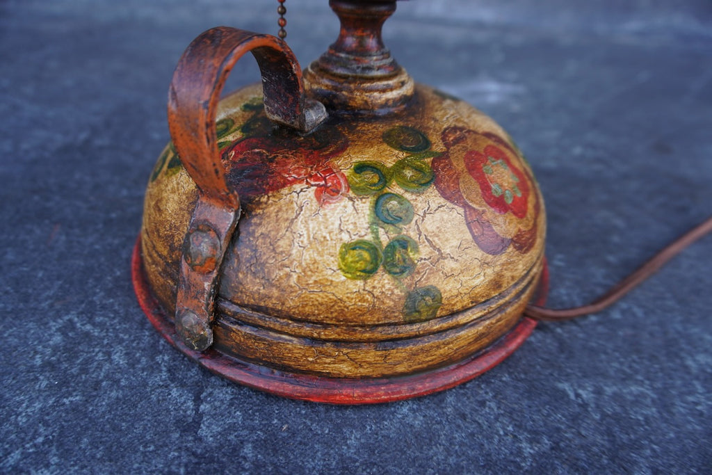 An original Monterey table lamp, embodying the warm, rustic character of early California design. The lamp features a hand-decorated base with a crackled finish and stylized floral motif in earthy tones, complemented by a weathered metal collar, scalloped shade, and clear glass chimney that evoke the look of traditional oil lamps. A side loop handle and pull-chain switch add to its vintage charm and functionality.
