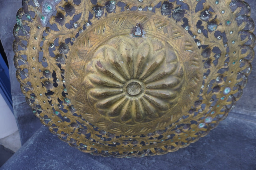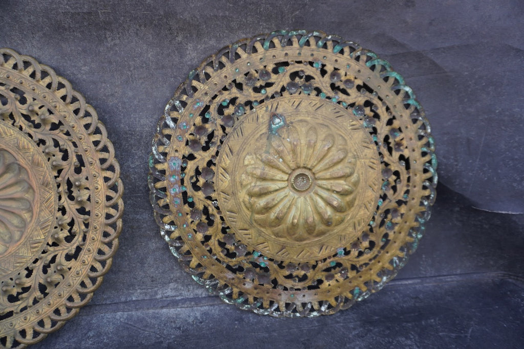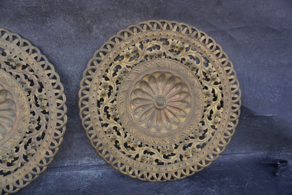 This stunning pair of brass wall medallions by Casa Grande are gorgeous. Each round medallion features an intricate pierced filigree border surrounding a sculpted floral rosette center, creating beautiful depth and texture. The warm brass finish showcases a rich, natural patina that highlights the ornate craftsmanship and adds a sense of old-world charm.
