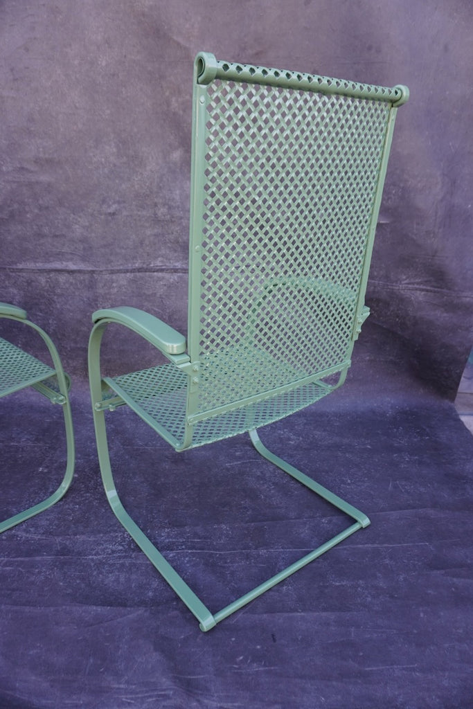 Charming pair of vintage spring metal lawn chairs dating to the 1930s, in the style of classic Howell Company designs. Featuring iconic cantilevered frames with flexible “spring” bases, these chairs offer both comfort and timeless industrial appeal.