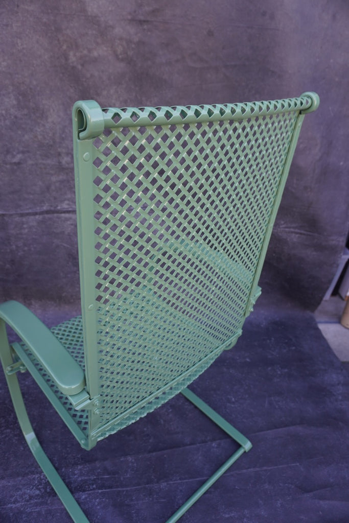 The perforated metal mesh seats and backs provide durability and breathability, while the newly applied powder-coated finish in soft sage green gives them a fresh, modern update.