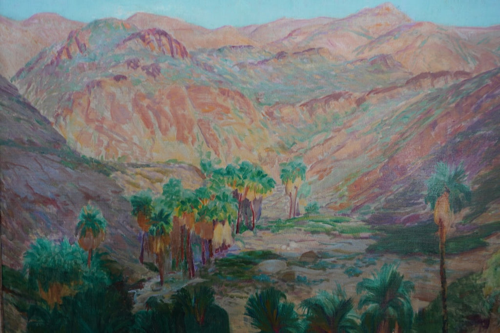 This vibrant desert landscape depicts Palm Canyon in Borrego Springs, with a winding wash lined by lush palms set against layered desert mountains. De Kruif’s expressive brushwork and pastel-inflected palette capture the warmth, light, and atmospheric depth of the Southern California desert. The contrast between verdant palms and arid terrain creates a balanced, inviting composition that emphasizes both serenity and scale.