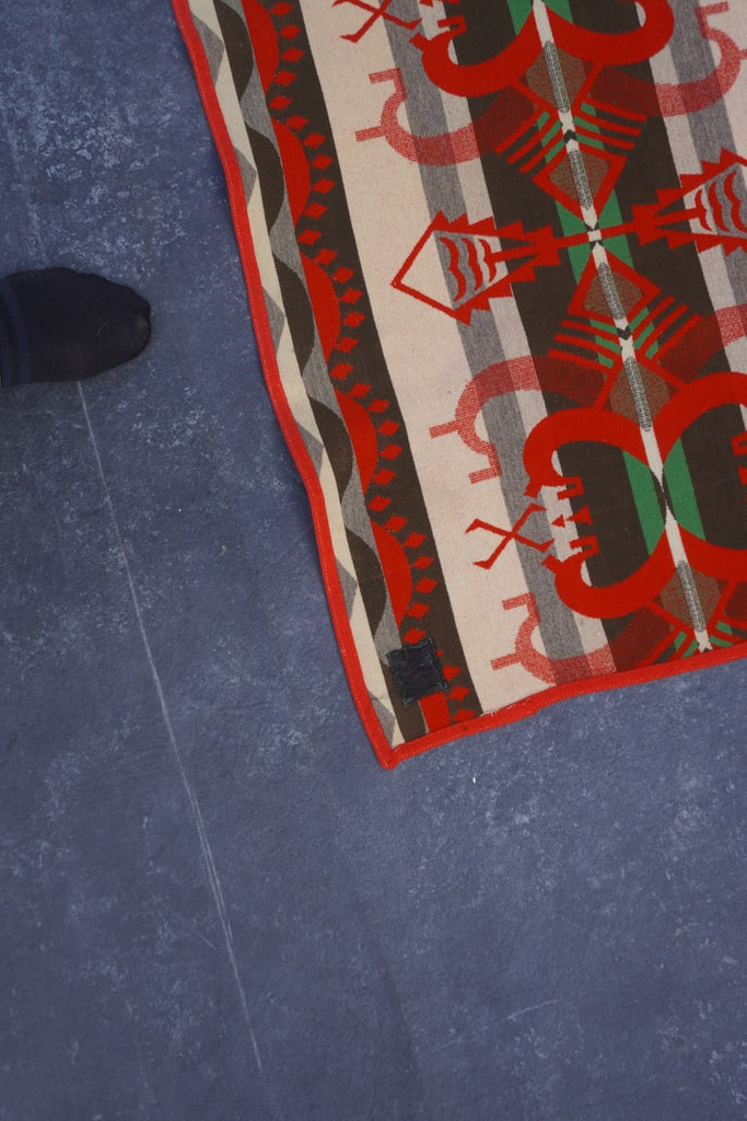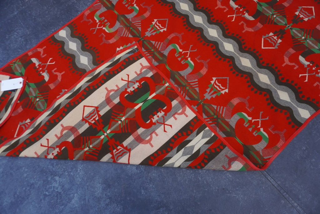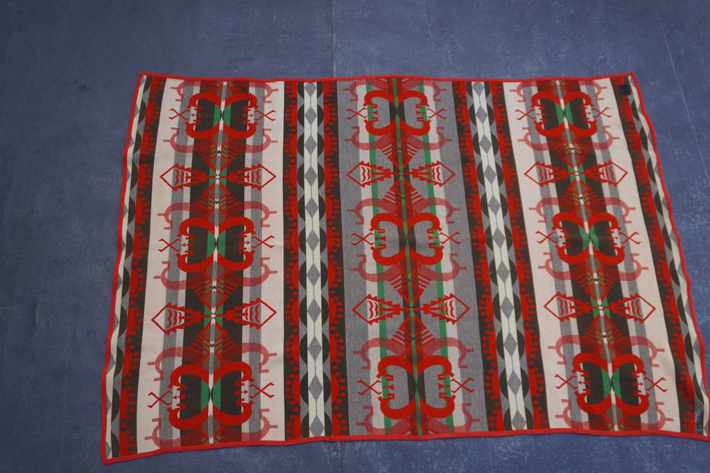 Beautiful vintage Pendleton Beaver State blanket featuring a Native American–inspired design in rich red and green tones. Expertly woven from pure wool, this blanket showcases the exceptional quality and craftsmanship that Pendleton is known for.