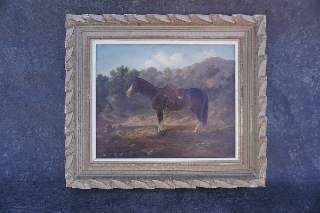 A charming early-20th-century oil painting depicting a saddled horse standing peacefully in a pastoral landscape. Painted by M. S. Fish and likely dating to the 1930s, the work captures a quiet rural moment with soft earth tones, distant hills, and natural greenery in the background. The horse, shown in profile, is carefully detailed and serves as the focal point of the composition.