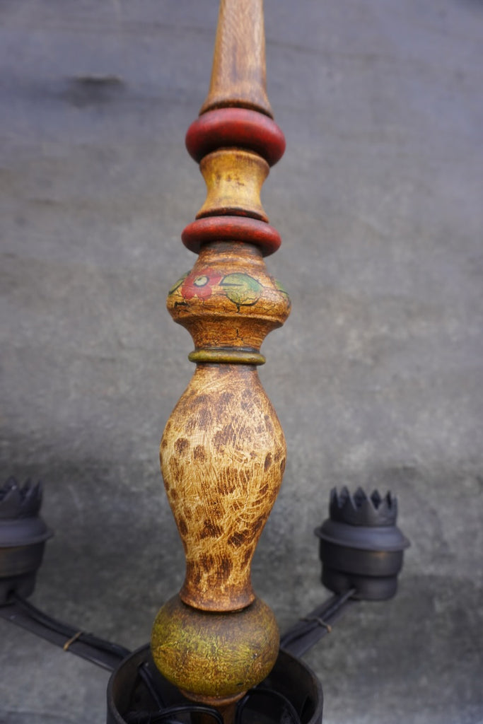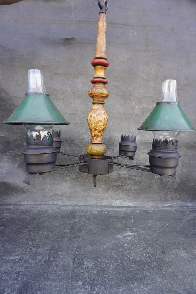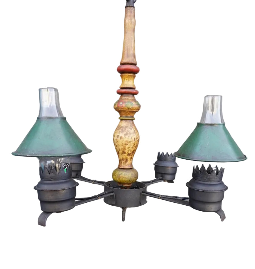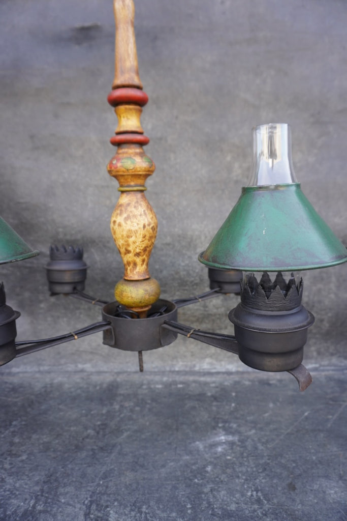 The fixture features a hand-turned central wooden column with a warm, naturally aged patina and subtle painted detailing. Extending from the center are four wrought-iron arms, each supporting original-style lantern housings with distinctive crown-cut galleries. The aged metal surfaces have been professionally cleaned and refinished to maintain their authentic character while ensuring long-term durability.