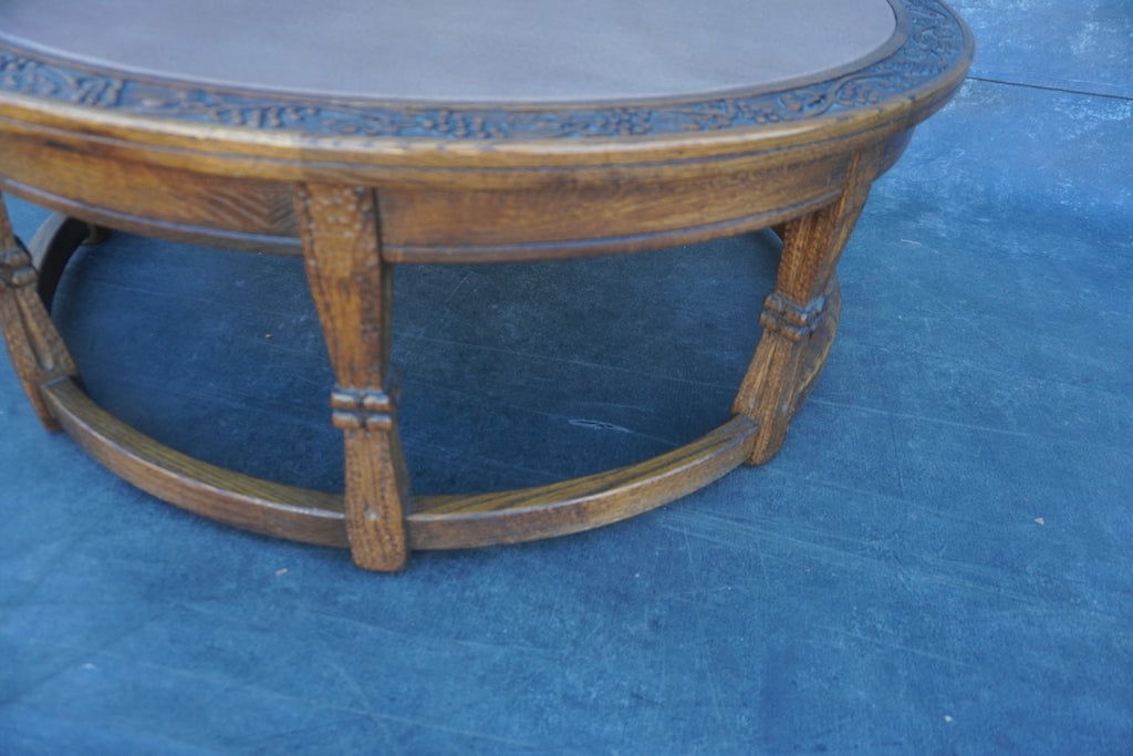 Beautiful round leather-top coffee table by Romweber Furniture circa 1936, crafted in the classic California Revival style. This striking piece features an carved grape-leaf motif surrounding the leather surface and finely hammered detailing on each leg—showcasing the exceptional craftsmanship for which Romweber is known.
