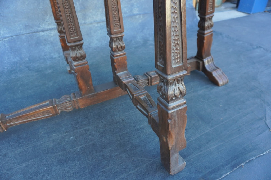 Exceptional California Revival–style game table by Romweber Furniture, crafted circa 1930s–1940s. This piece beautifully captures the craftsmanship and design language for which Romweber was renowned—solid construction, intricate carving, and a balance of rustic elegance and refined detailing.