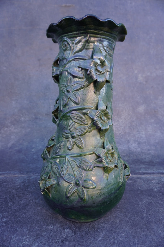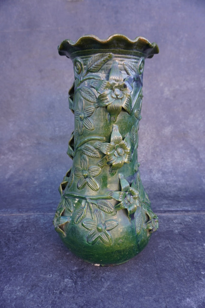 A striking vintage Mexican pottery vase featuring a rich emerald-green glaze and intricate hand-applied floral and vine motifs. This tall decorative piece reflects the traditional pottery style of Santa María Atzompa, Oaxaca, a village renowned for its distinctive green-glazed ceramics. Sculpted flowers, leaves, and winding stems in raised relief wrap around the surface, creating beautiful texture and depth.