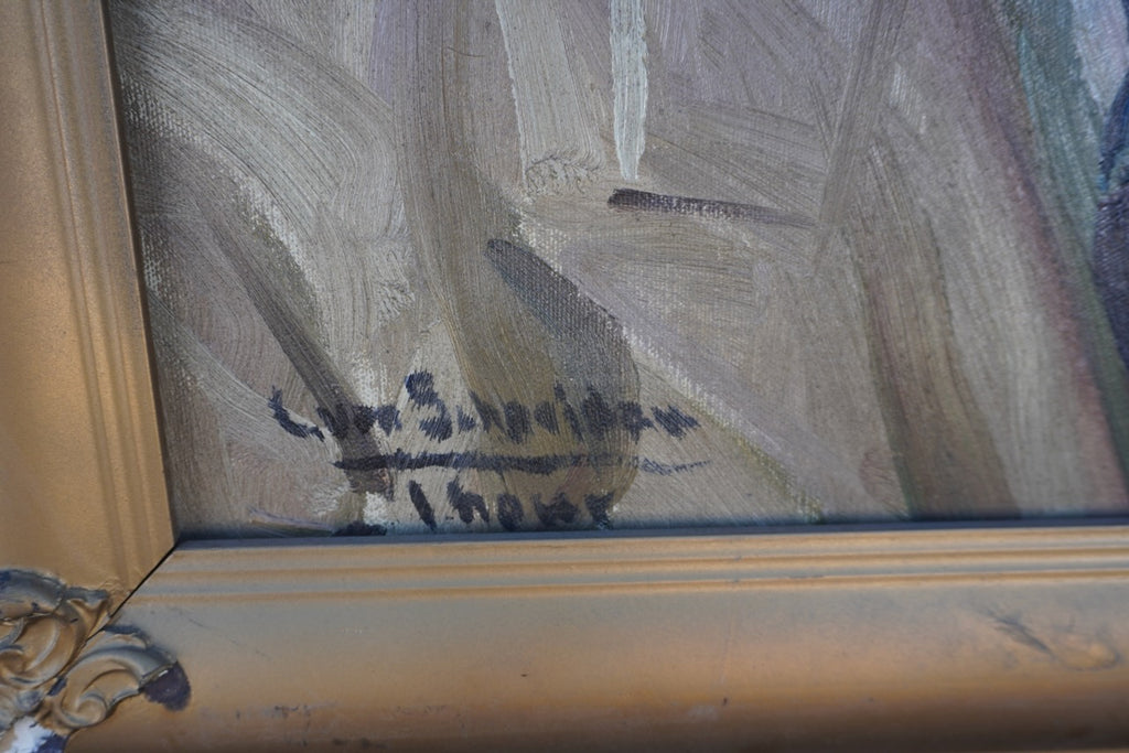 The composition balances realism with a painterly looseness characteristic of mid-20th-century studio portraiture. Schneider’s signature appears at the lower left, adding to the work’s authenticity. Housed in a vintage gilt frame with decorative corner elements and light wear consistent with age, the piece retains a classic and elegant presentation.