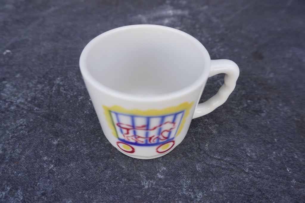 A Union Pacific Railroad dining car mug, made for use aboard Union Pacific passenger trains. The white mug features a colorful circus animal design in red, blue, and yellow, depicting a lion standing inside a train car or cage, with stylized wheels below—evoking the playful imagery used for children’s service ware on board.