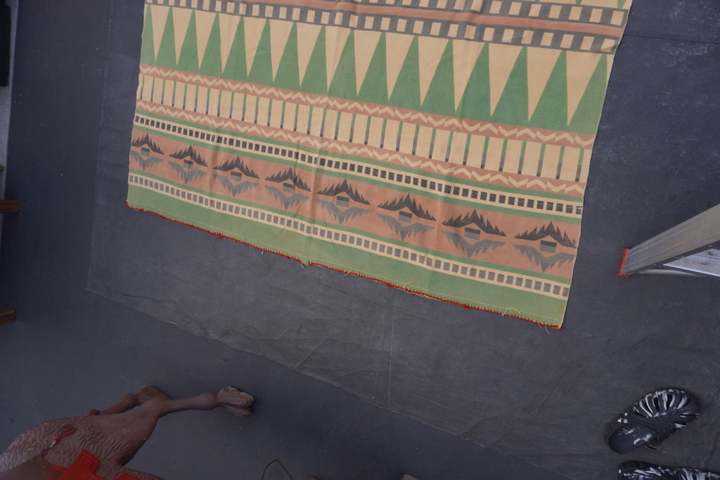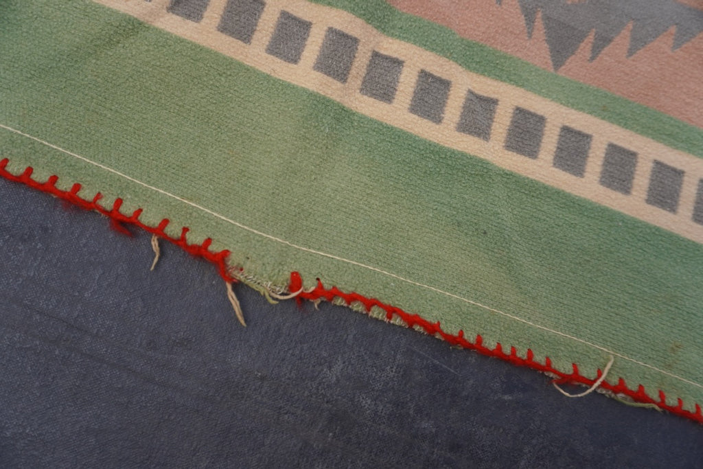 Beautiful vintage Beacon blanket featuring a classic Southwestern geometric design in a soft green and beige color palette. Woven from warm, durable wool, this early 20th-century textile showcases the distinctive style and craftsmanship that made Beacon blankets an American favorite for generations. The muted tones and bold pattern lend a timeless, rustic charm that complements both traditional and modern interiors.