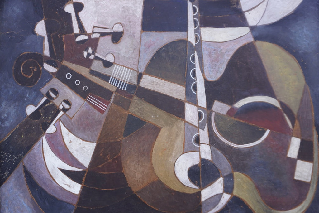 A striking modernist composition by Mexican artist Jose Maria de Servin (1917–1983), this painting presents an abstracted still life of musical instruments—likely a violin and wind instrument—rendered in bold, geometric forms. The composition is layered with intersecting planes, curved shapes, and a muted yet earthy palette of browns, ochres, blacks, and soft whites, reflecting a distinctly Cubist influence. The stylized fragmentation and rhythmic arrangement evoke both movement and harmony, echoing the musical subject matter itself.